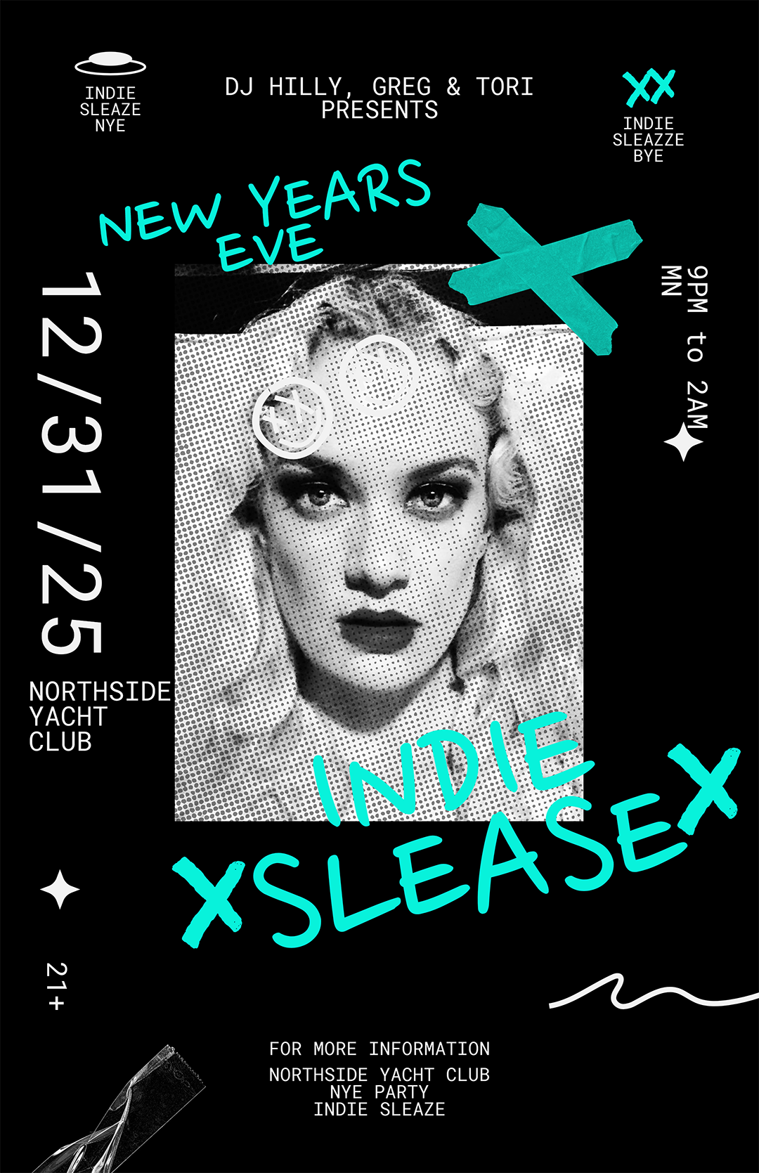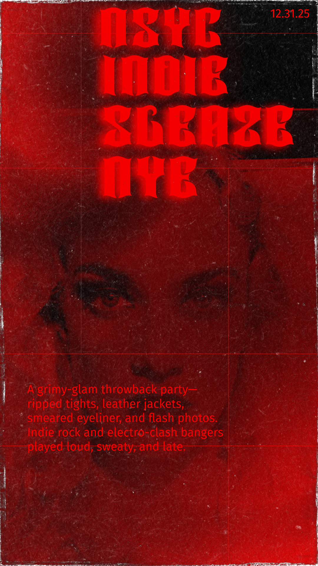 A grimy-glam throwback party—ripped tights, leather jackets, smeared eyeliner, and flash photos. Indie rock and electro-clash bangers played loud, sweaty, and late.