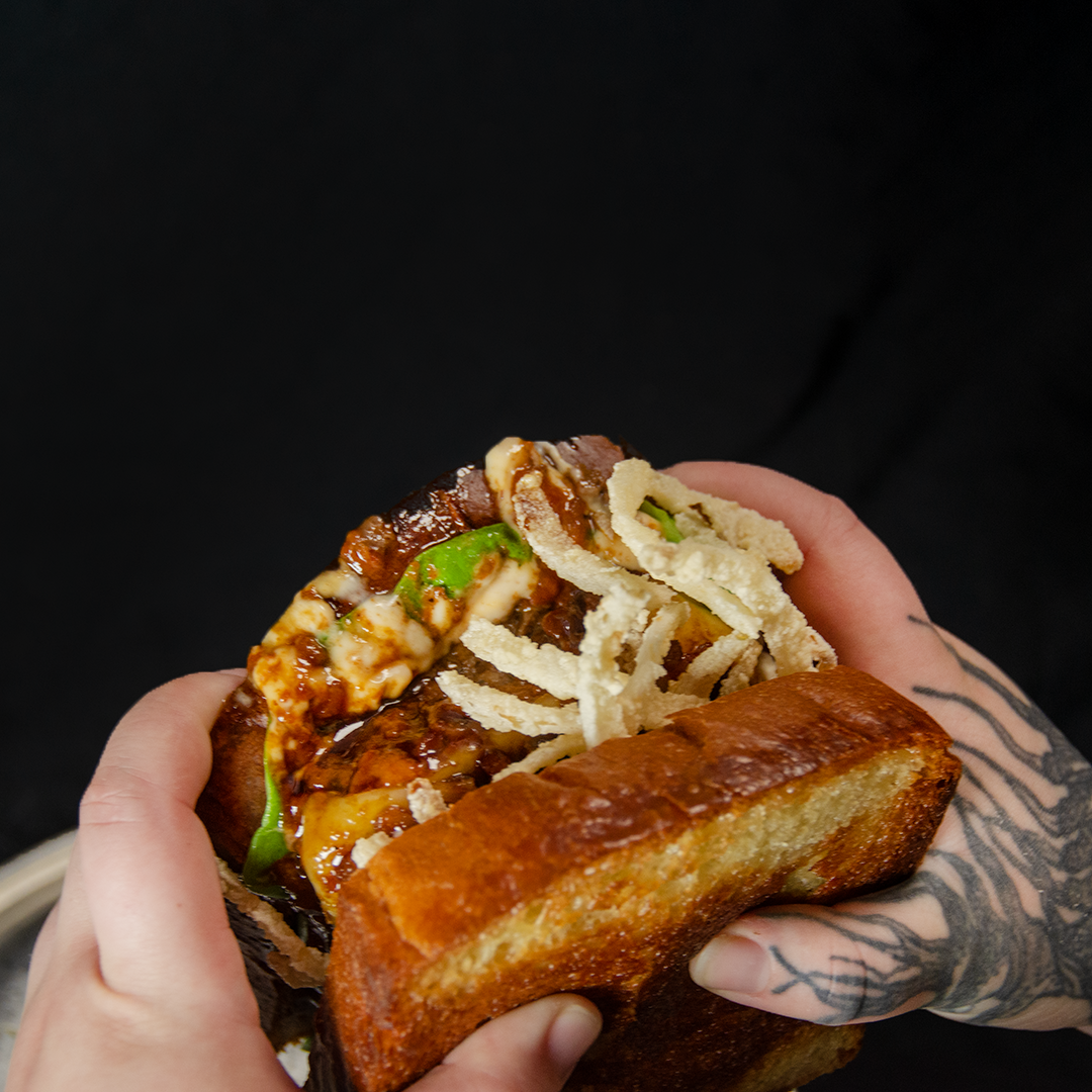 two avril-bleh smashed beef patties, usa cheese, lettuce, onion, pickle, mayo on a grilled 16 Bricks potato bun